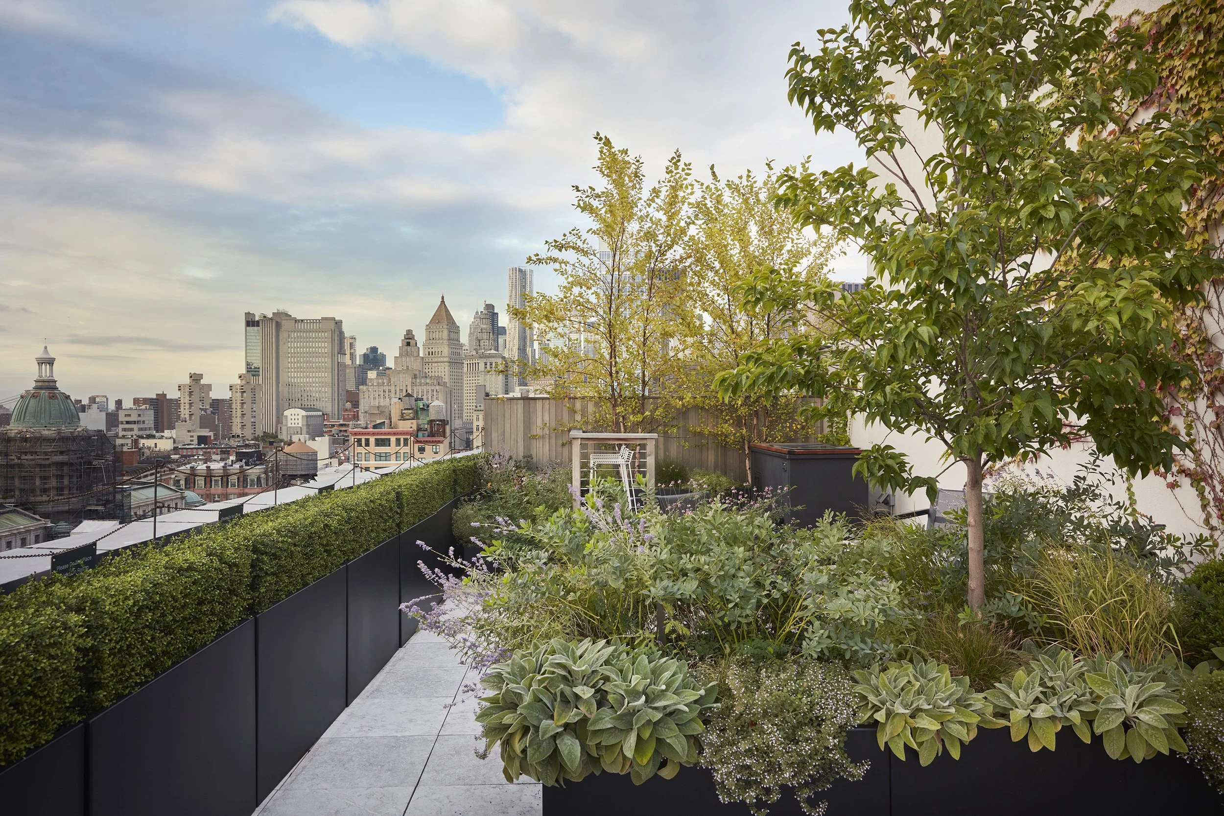 This Tribeca penthouse was designed as a multi-functional rooftop retreat, blending luxury amenities with a natural, urban aesthetic. We used a palette of sophisticated materials, from turkish marble pavers to a custom steel and cedar pergola, to create a series of distinct spaces for dining, lounging, and wellness. The design features a full outdoor kitchen, a cold plunge, and a sauna, all surrounded by a curated selection of sun-loving plants in Italian terracotta pots. This space proves that even in the heart of the city, you can craft a private sanctuary that’s both high-end and deeply connected to nature.